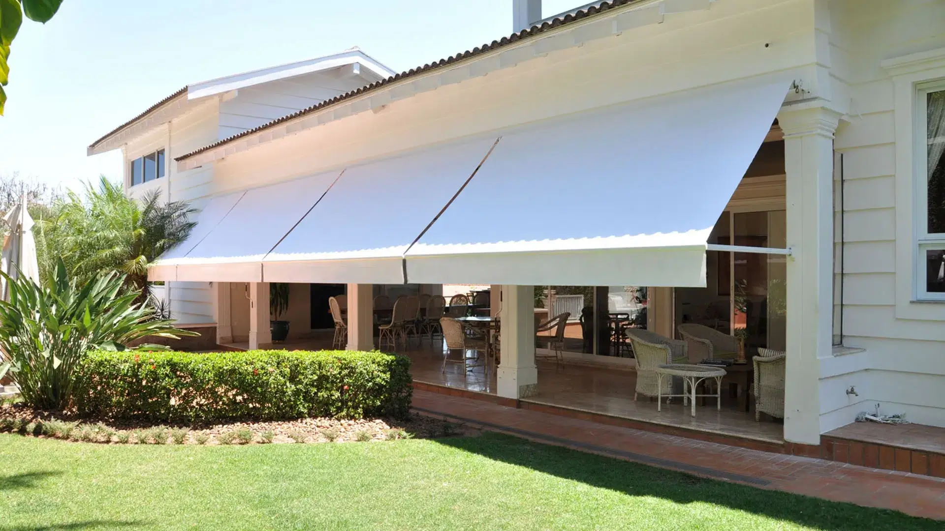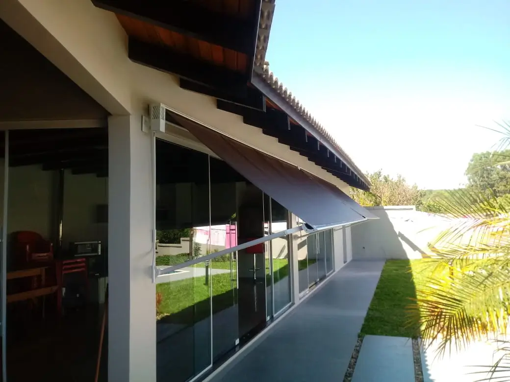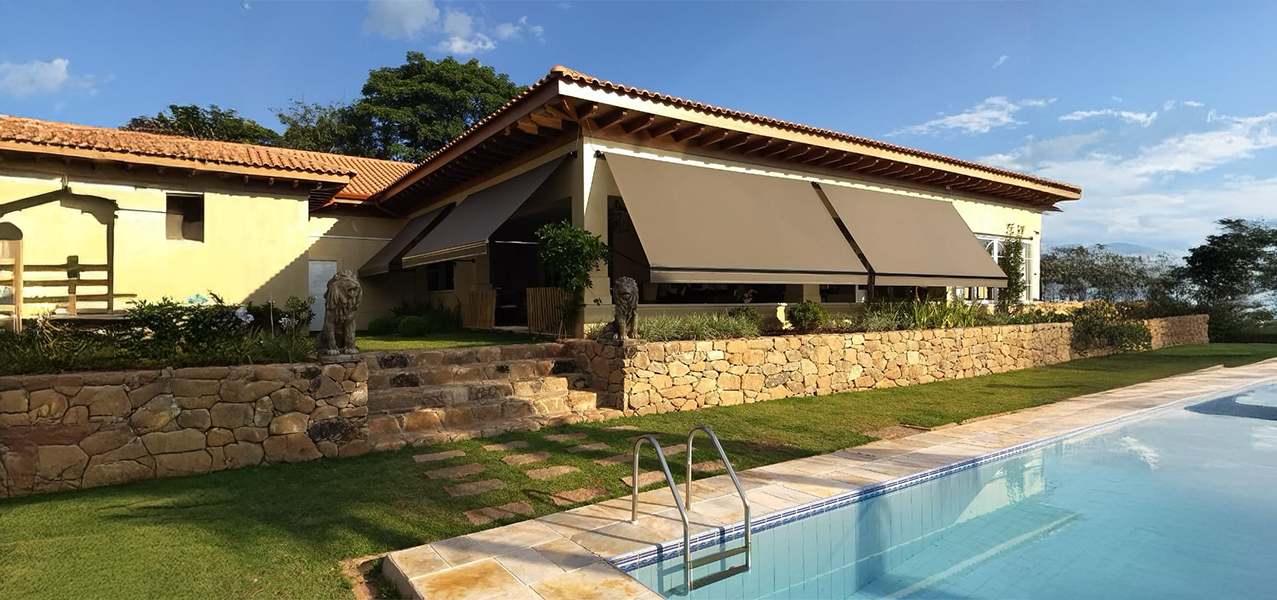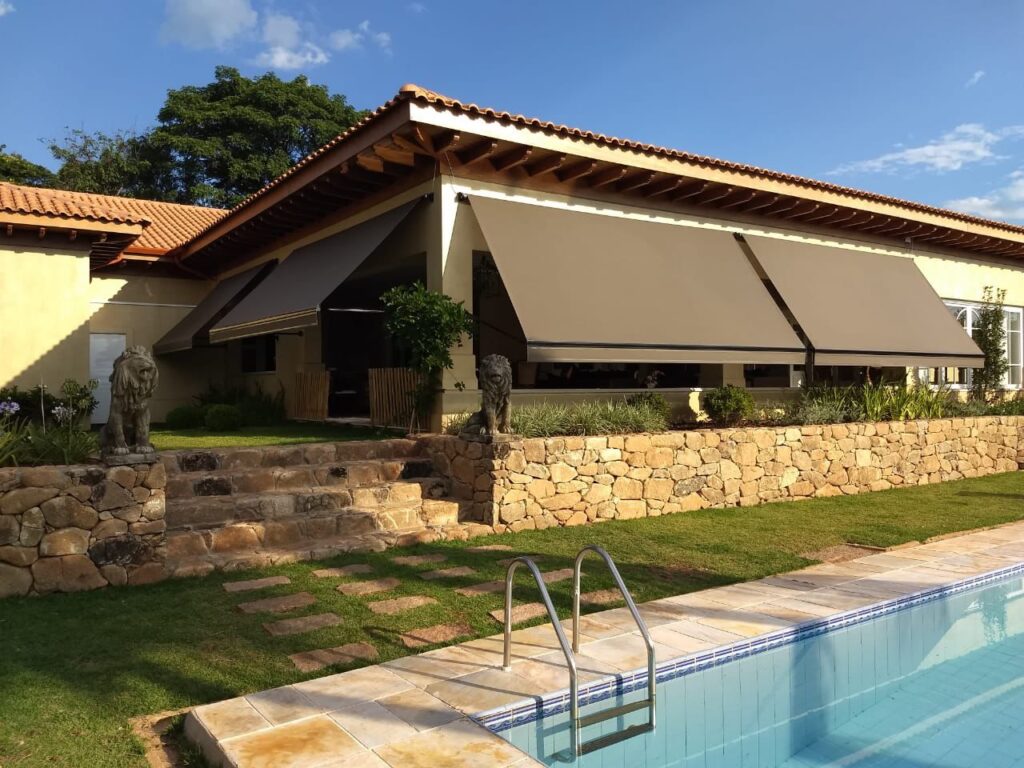 Seu grande diferencial está nos braços articulados com sistema pivotante, que permitem ajustar a inclinação do toldo de acordo com a posição do sol, garantindo conforto térmico e visual ao longo do dia.